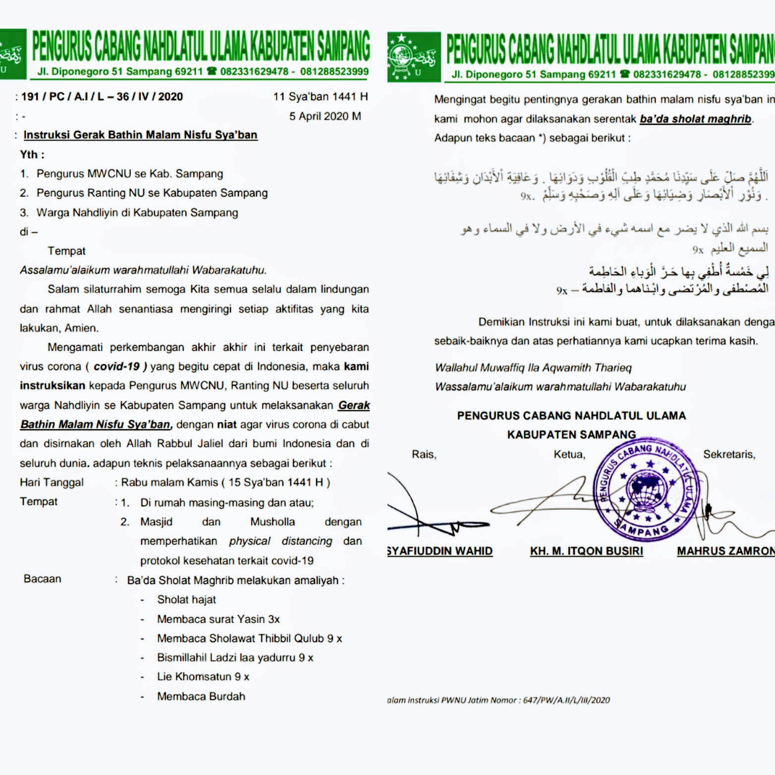 nusampang.com – Pengurus Cabang Nahdlatul Ulama (PCNU) Kabupaten Sampang mengeluarkan instruksi kepada pengurus MWC NU, Ranting NU dan warga Nahdliyyin se- Kabupaten Sampang untuk melaksanakan gerak bathin malam nisfu sya’ban pada hari Rabu malam (8/4/2020) setelah sholat Magrib. Instruksi tersebut dituangkan dalam surat nomor 191/PC/A.I/L-36/IV/2020, tertanggal 5 April 2020.